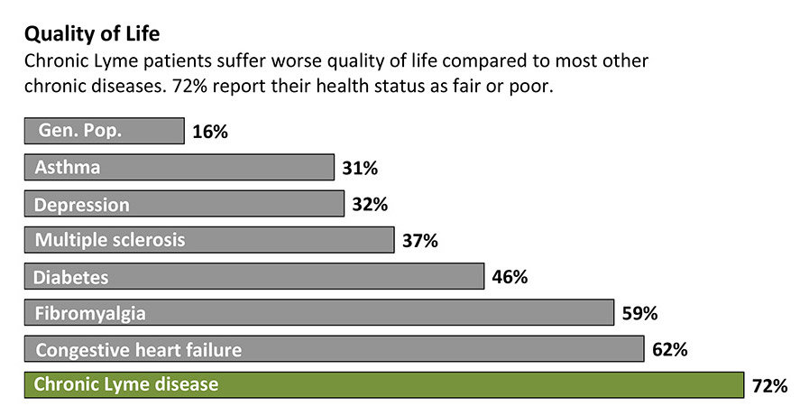 A krónikus Lyme-kór betegek alacsonyabb, rosszabb életminőségben szenvednek összehasonlítva a többi krónikus betegséggel diagnosztizált beteggel. (Lymedisease.org)