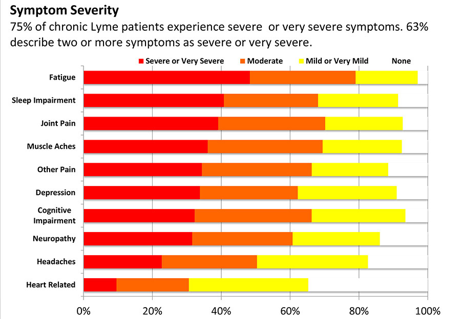 És ami a krónikus Lyme-kór tüneteit illeti, ilyen betegek 75%-a súlyos vagy nagyon súlyos tüneteket tapasztal.